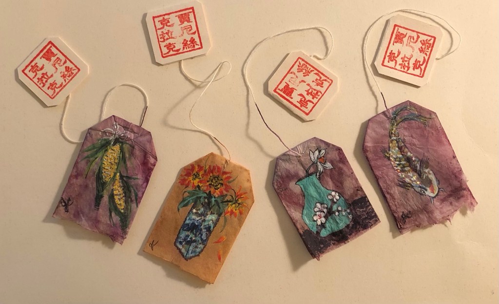 After reading about the art form and seeing one artist’s paintings, I decided to try my hand at painting on used tea bags.